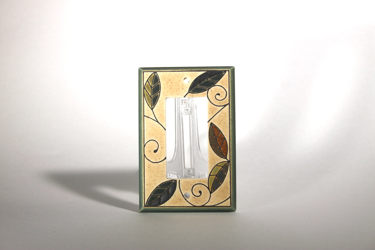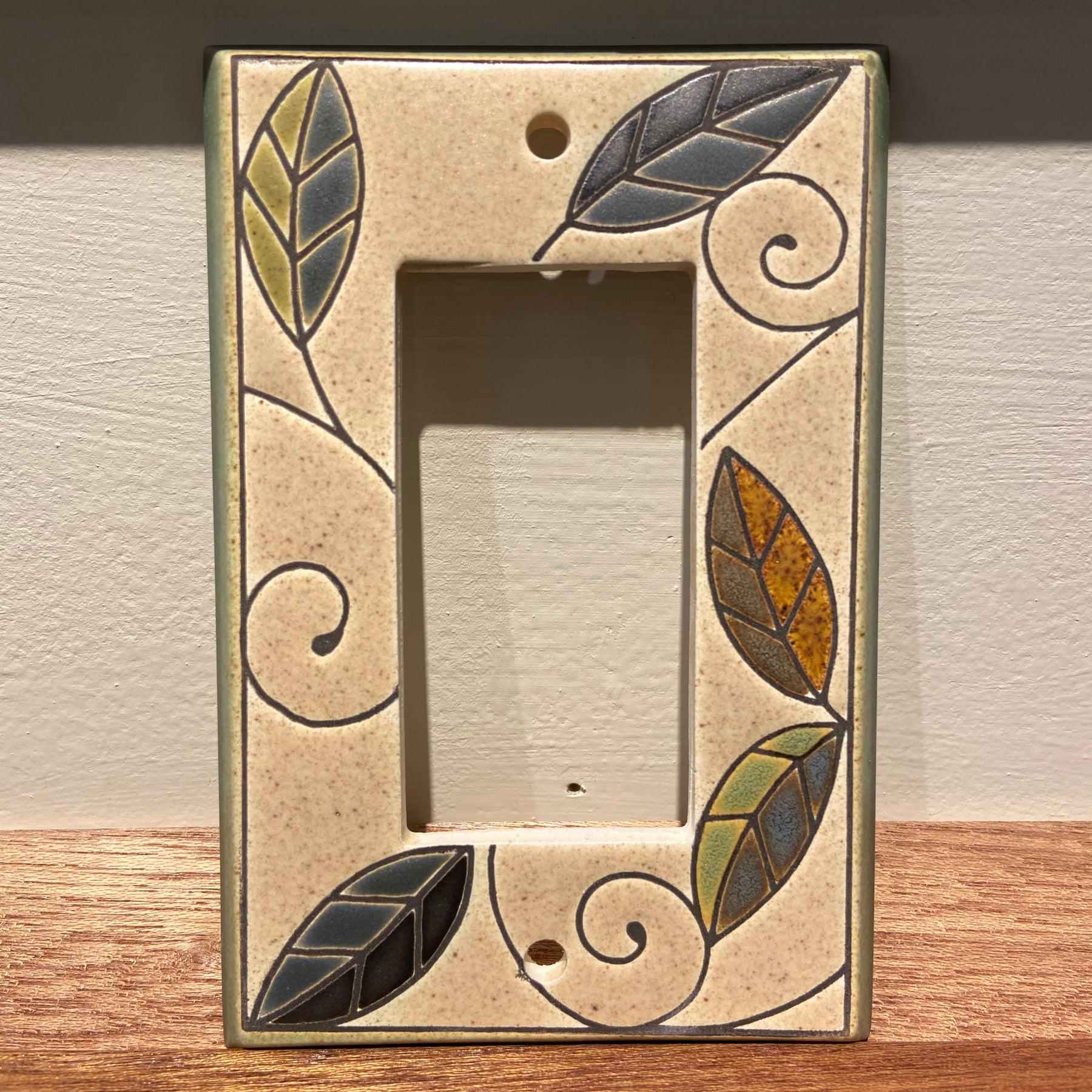 The Single Rocker Mosaic Leaves by ALL FIRED UP is a decorative ceramic switch plate cover with a rectangular cut-out. It features a beige background adorned with swirling lines and colorful leaf designs in green, blue, orange, and gray. This custom-made piece from Canada is placed on a wooden surface against a light wall.