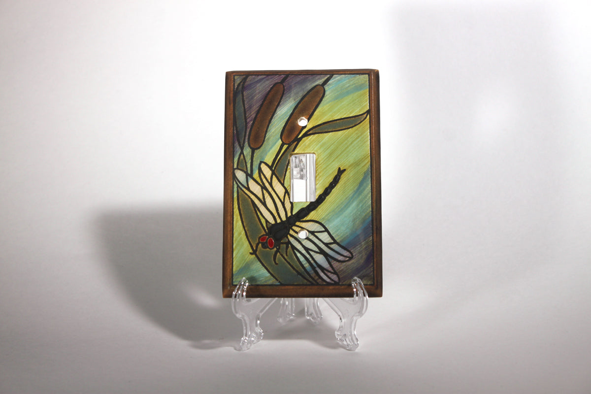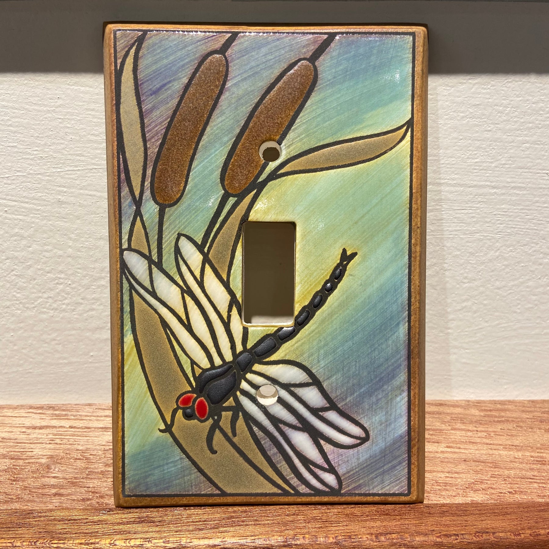 The "Single Dragonfly Bulrush" light switch cover by ALL FIRED UP features a charming decorative design with a dragonfly, complete with red eyes and transparent wings among cattails. Set against hues of blue, green, and brown, this Canadian-crafted wooden piece beautifully enhances any collection of ceramic switch plate covers.