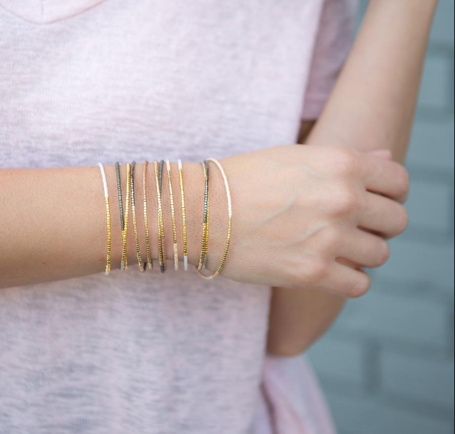 The most delicate design yet!! The Norah Collection features tiny glass beads in eight different colors with a gold focal center. Coordinate earrings, mix & match colors to create a stack, or just wear one bracelet for the most dainty little bit of sparkle!! Norah bracelets are tagged with one of 5 different inspiring features. This makes for a great gift-giving experience!