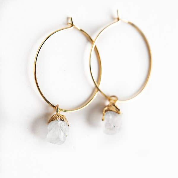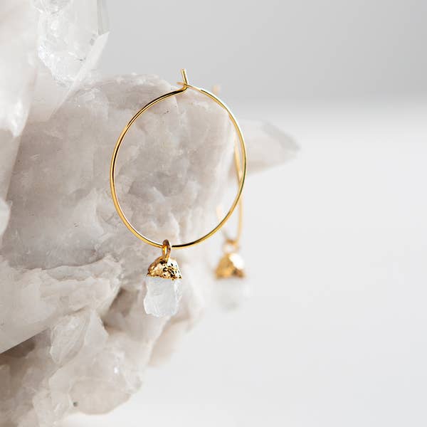 The Lenny & Eva 10mm Gemstone Amazonite beaded bracelet features round, multicolored stones in shades of blue, brown, and gray. It includes several brass accents and a gold-framed druzy quartz charm hanging from the center. The bracelet is set against a white background and stretches to fit most wrists.
