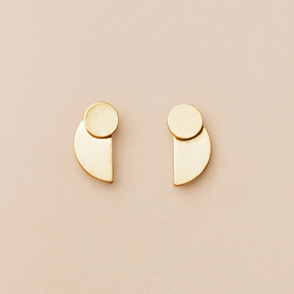 From the Refined Earring Collection, the Eclipse Stud Gold earrings by Scout Jewelry are crafted in 18k gold vermeil and showcased against a light beige background. These minimalist pieces feature small circular and semi-circular shapes arranged in a modern, geometric design.