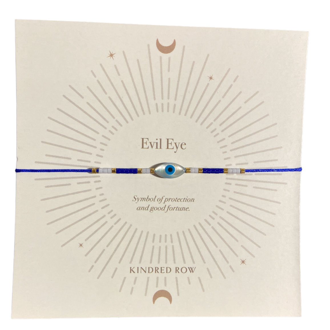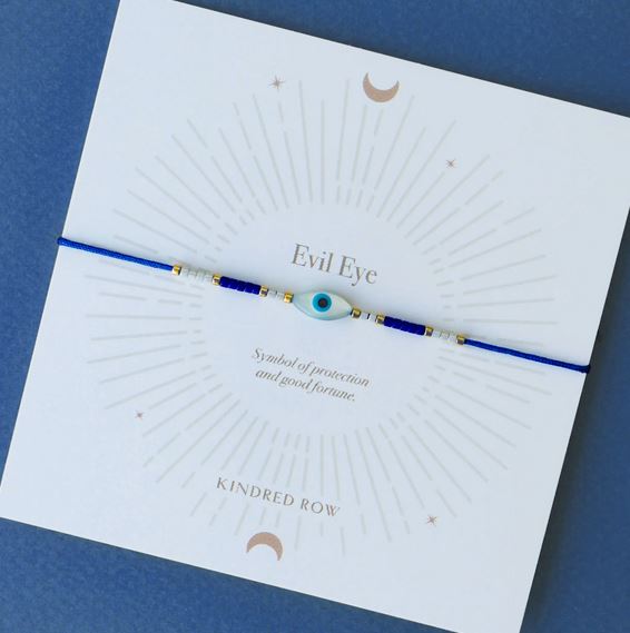 The Evil Eye Cord Bracelet Blue, featuring a small evil eye charm and a thin blue cord, is displayed on a white card with a radial design and the text "Evil Eye. Symbol of protection against bad luck and good fortune." The card bears the Kindred Row branding.