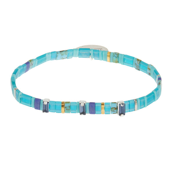 - Materials: 5mm width Japanese glass Miyuki beads, stretch cord, 3 sparkly rhinestones, Sterling Silver dipped Scout Charm.