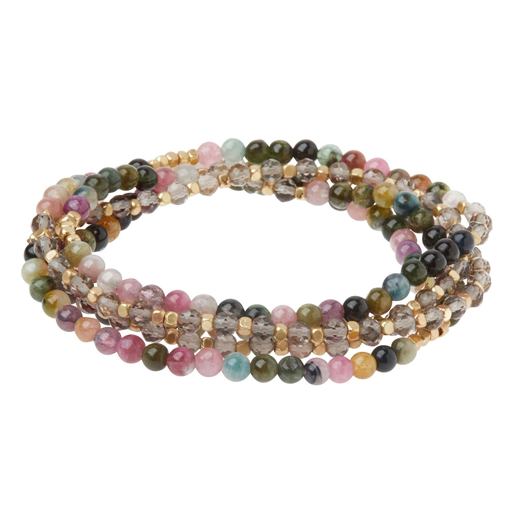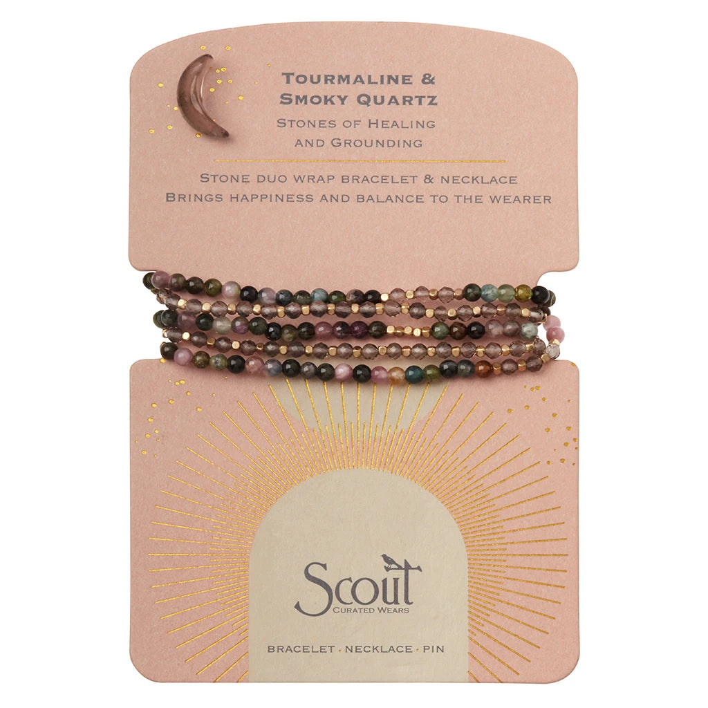 A combination of two gemstones creates a duet of stone power. Wrap as a bracelet or layer as a necklace and pair with the accompanying crescent moon stone pin.