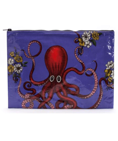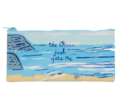 The Blue Q "Oh the places Zipper Pouch" is made from eco-friendly recycled material and features a mermaid on a scooter with luggage, surrounded by sea creatures. Playful text reads: "Oh! The places this bag will go!.