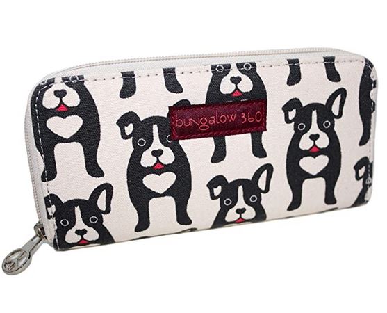 The Zipper Wallet Happy Dog by Bungalow 360 showcases a charming cartoon dog design, where brown dogs with long ears and pink noses are repeated across the cotton canvas material. A sewn label displays "Bungalow 360" in red text. This vegan wallet is not only stylish but also supports animal causes proudly.
