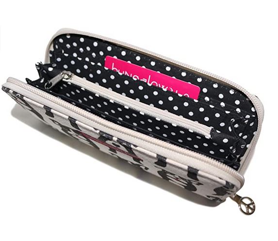 The Zipper Wallet Bat by Bungalow 360 showcases an open design with a charming red polka dot interior made from cotton canvas. It features distinctive patterns, multiple compartments, a zippered pocket, and a visible pink card slot—perfect for animal and pet lovers looking for both style and functionality.