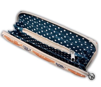 A close-up of the Zipper Wallet Happy Dog by Bungalow 360, crafted from cotton canvas, highlighting its multiple zippered compartments lined with brown fabric and white polka dots. The beige exterior showcases a subtle pattern, ideal for those who support animal causes.