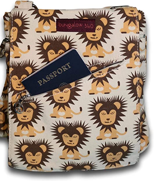 The Sm Messenger Bat by Bungalow 360 is a white and black backpack adorned with a unique cartoon bat pattern. Crafted from natural, durable cotton canvas, the backpack features a visible front pocket that can hold items like a United States passport. It also comes with a top handle and adjustable shoulder straps for added convenience.