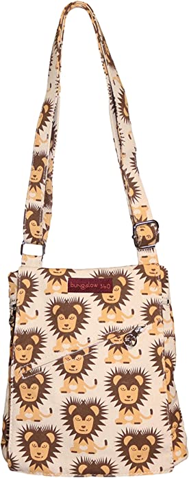 The Sm Messenger Cat from Bungalow 360 is a crossbody bag featuring unique designs with repeated prints of black and grey cats, each with green and yellow eyes wearing blue glasses, alongside white heart shapes. It includes a front zipper pocket and proudly carries the brand's name "Bungalow 360," known for being 100% vegan.