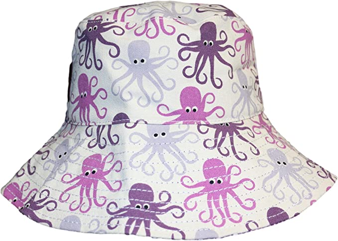 The Beach Hat Octopus by Bungalow 360 is a white bucket hat adorned with a distinct pattern of purple and pink cartoon octopuses, each sporting a cheerful smile. This reversible beach hat is both charming and packable, making it an ideal choice for your upcoming seaside adventure.