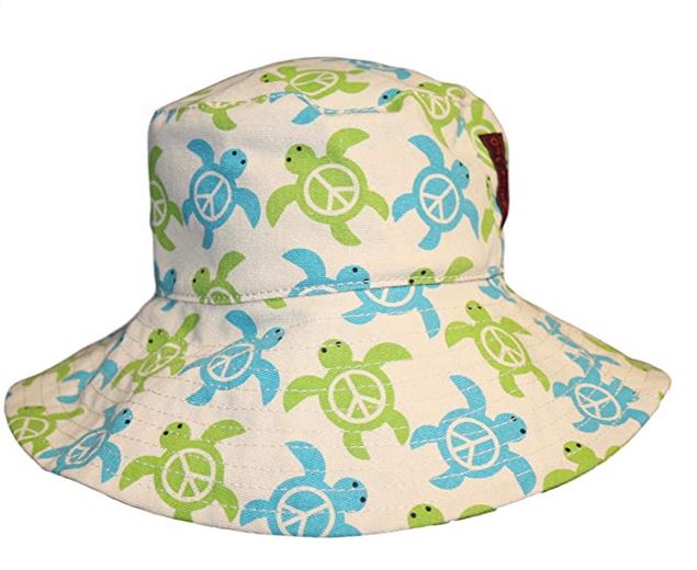 The Bungalow 360 Beach Hat Sea Turtle showcases a distinctive design featuring green and blue turtles, each with a peace symbol on their shell. Its light beige background makes it an ideal packable travel companion for sunny adventures.