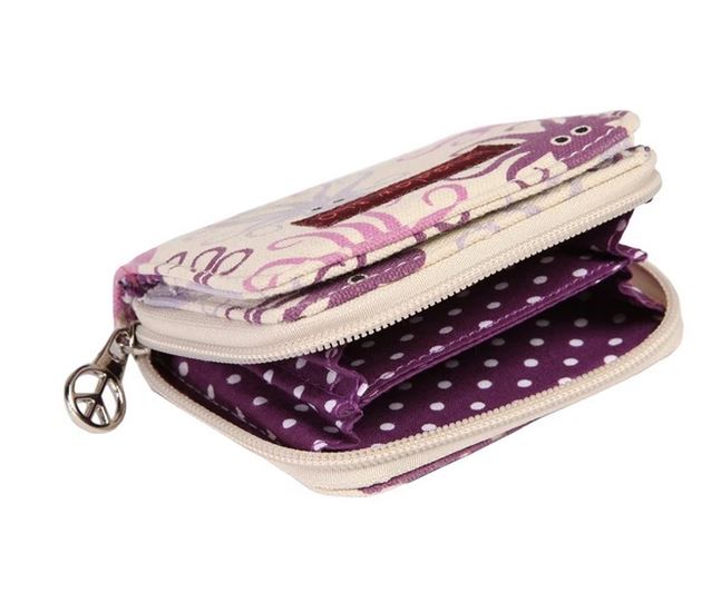 - Features: Coordinating Polka-dot lining, signature peace-sign zipper pull,velcro closure
