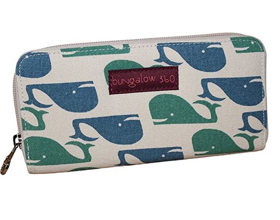 This vegan wallet, named the Zipper Wallet Whale and crafted by Bungalow 360, features a distinctive design with blue and green whales against a beige background, highlighted with a maroon label that reads "Bungalow 360.