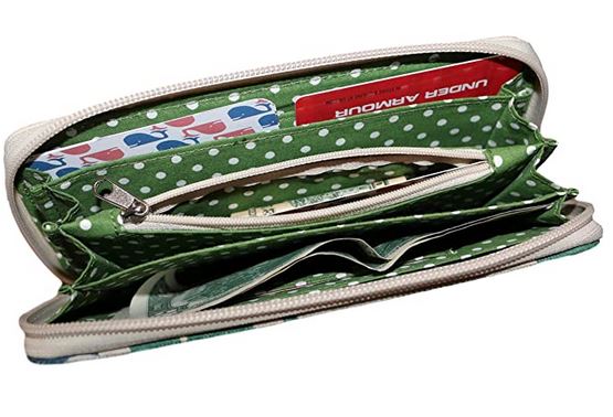 The Zipper Wallet Whale by Bungalow 360 showcases unique designs with a vibrant green polka dot interior and multiple compartments. It easily accommodates a red Under Armour card and numerous paper currency notes. A central zipper pocket provides an ideal spot for organizing your essentials.