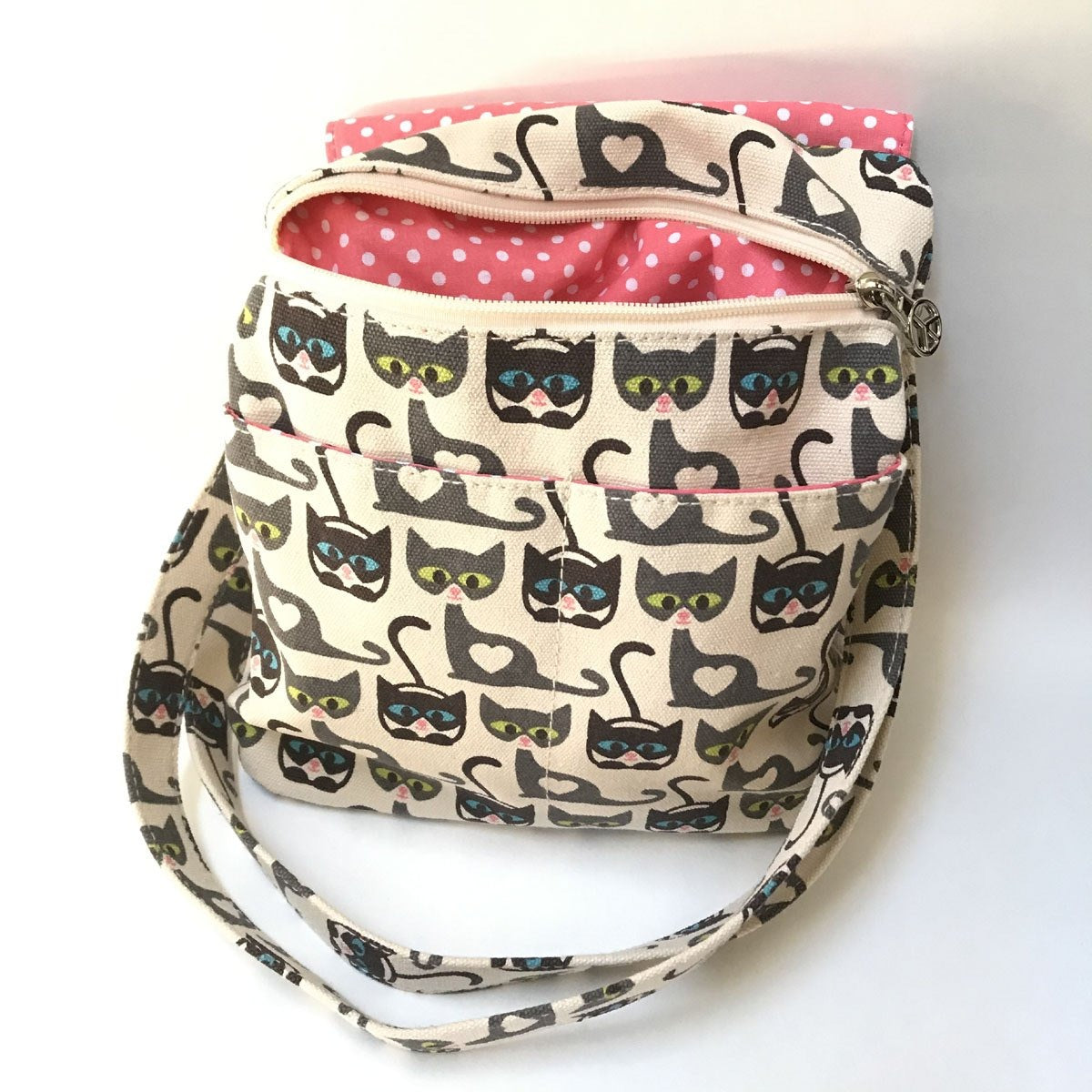 - Cute polka dot lining. Outer zipper pocket on flap. Flap closure with two pockets under flap
