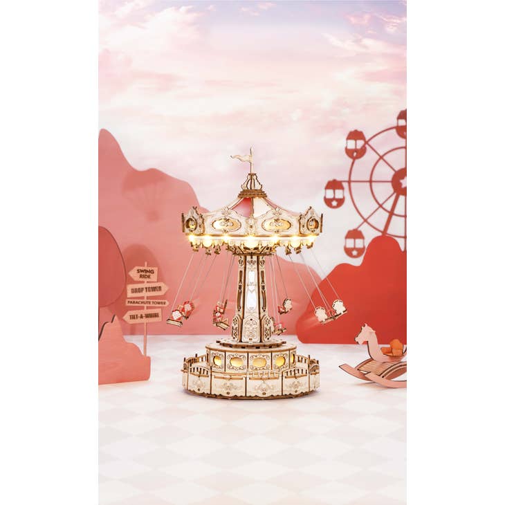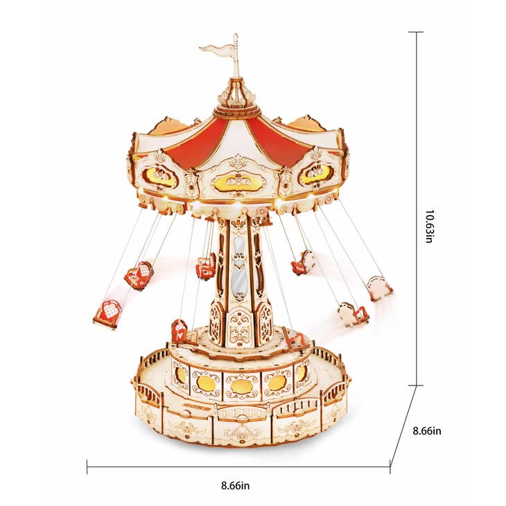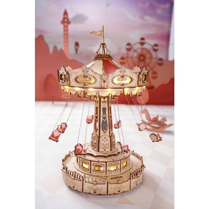 Hands Craft, Electro-Mechanical Wooden Puzzle: Swing Ride with LED lights, amusement park series. Perfect for birthdays, a crafting hobby project, and makes great home or office decor. Build your very own amusement park series.