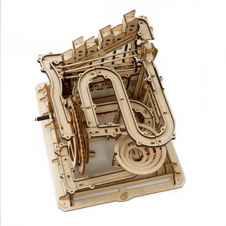 Marble Run, DIY Laser-Cut 3D Wooden Puzzle Waterwheel Coaster. Assembled Size: 255 x 235 x 185 mm. Package Size: 317 x 233 x 46 mm. Puzzle Pieces: 254 pcs.