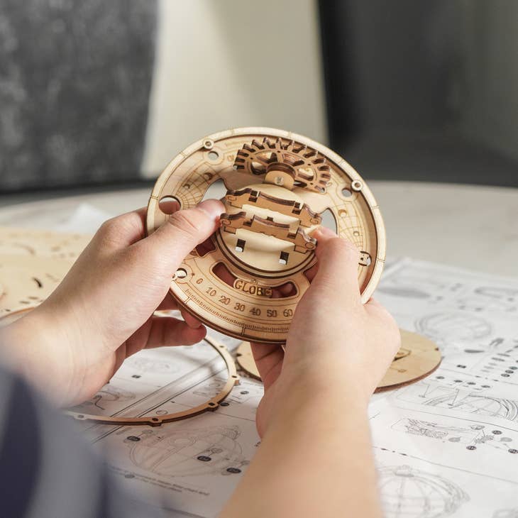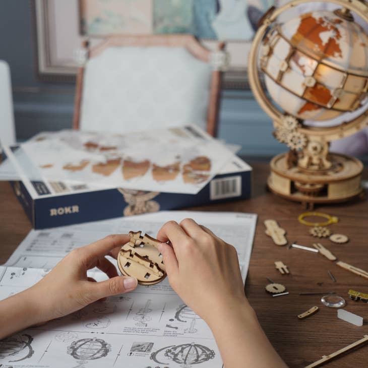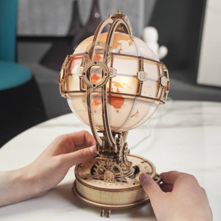 The Luminous Globe makes a classically sophisticated gift for yourself or a loved one: once complete, it has an orbital magnifier, can rotate when the mechanism is cranked, and can be a practical night light with a warm glow for your room. This 3D wooden globe puzzle is perfect for a fun time with your family or friends and makes excellent decor for any room. • Assembled Size: 167 x 203 x 293mm (6.6 x 8 x 11.5 inches) • Wood pieces: 180pcs • Recommended ages: 14 years and up