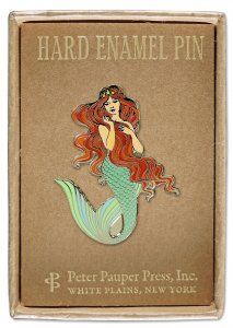 The Mermaid Pin, a hard enamel piece featuring a mermaid with long red hair and a green tail, measuring 2-3/8 inches, is beautifully displayed in a gift box. The text on the box reads "Hard Enamel Pin" at the top and "PeterPauperP, White Plains, New York" at the bottom.