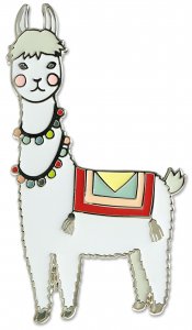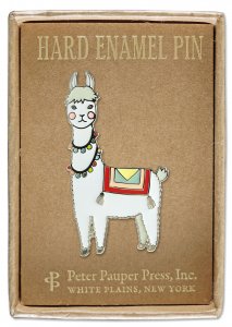 A Llama Pin adorned with vibrant decorations is presented in an elegant gift box, labeled "Hard Enamel Pin" and featuring the branding "PeterPauperP, White Plains, New York.