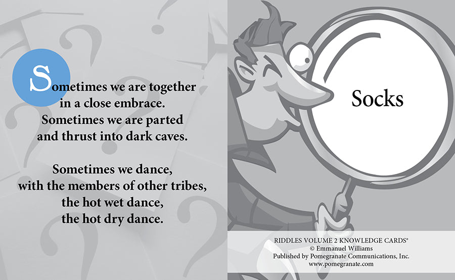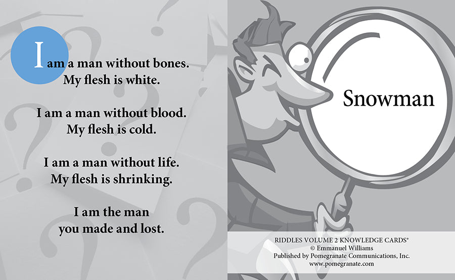 - Riddles are the oldest language game in the world. The 48 brain benders collected here will beguile all ages, feeding young minds and keeping old brains sharp and active. This follow-up deck to poet and educator Emmanuel Williams’s best-selling Volume 1 is a perfect solo amusement or group activity: on the front of each card, a wily description hints to a common object’s identity; on the back, a forehead-smacking reveal awaits. Stump your friends and family—and yourself!