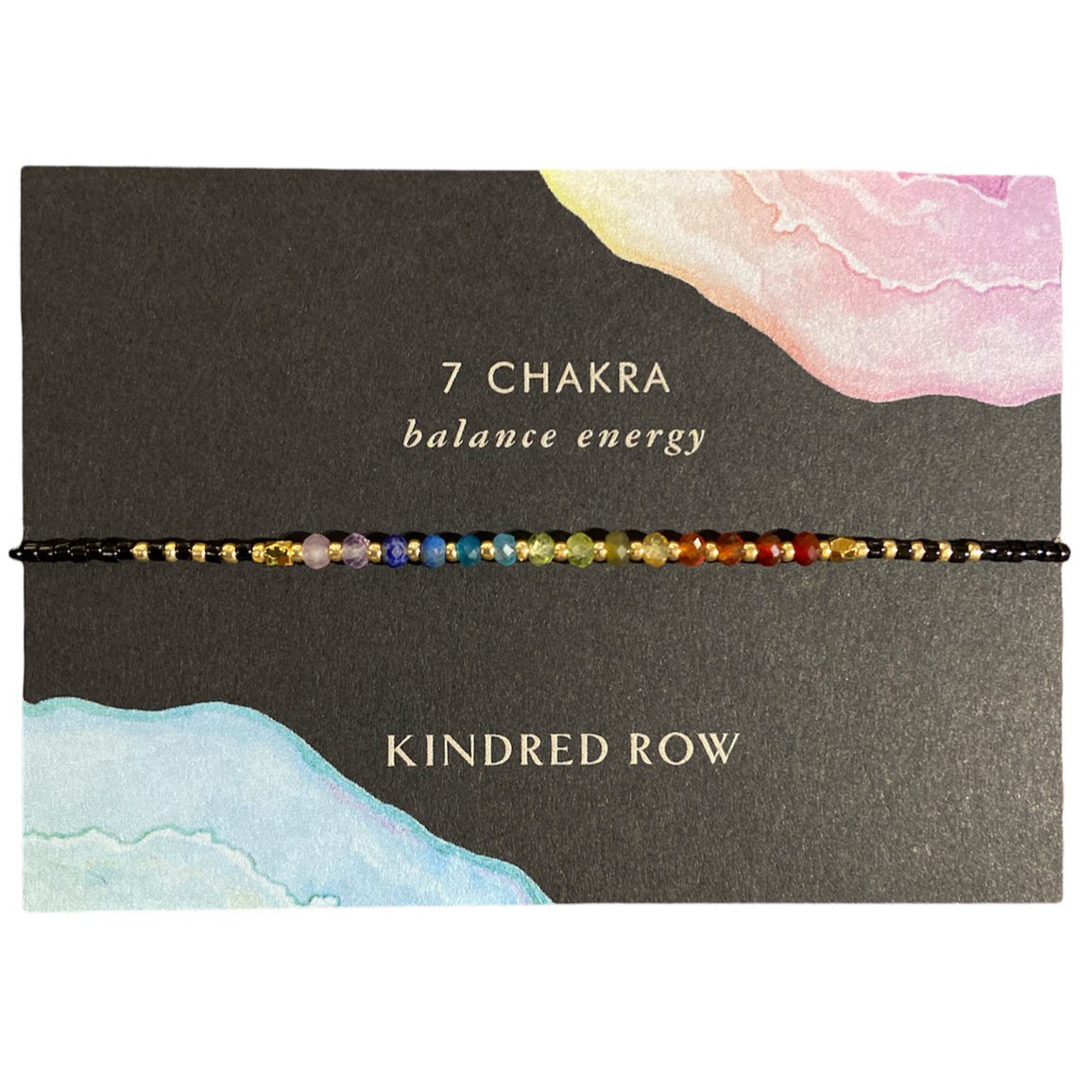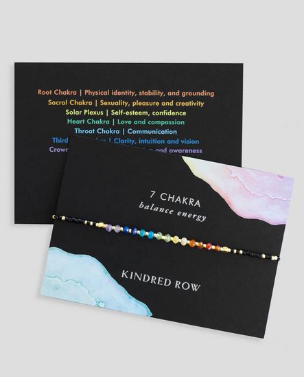 The Chakra Healing Gemstone Stacking Bracelet by Kindred Row is a handcrafted piece adorned with multicolored beads crafted from natural gemstones representing the 7 chakras. It is elegantly presented on a card inscribed with "7 CHAKRA balance energy" and "Kindred Row," featuring delicate watercolor designs, and includes an adjustable cord for an ideal fit.