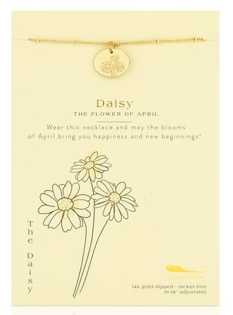 The Birth Flower April Daisy necklace by LuckyFeather is a delicate 14k gold-dipped piece featuring a fine chain and a round, engraved pendant. It offers an adjustable clasp with a short extension for the perfect fit.