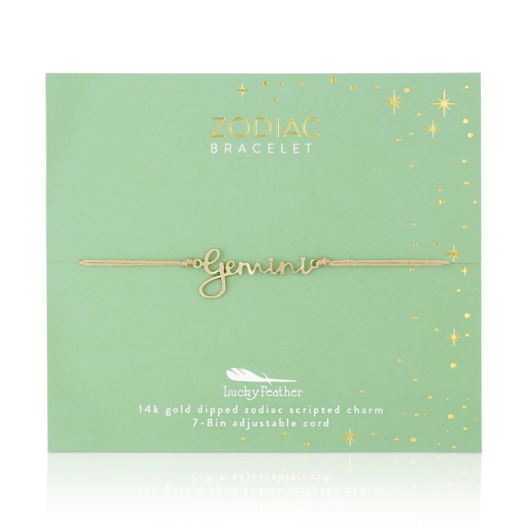 The nickel-free zodiac bracelets feature an adjustable cord bracelet secured by a miniature star charm along with a charm depicting the name of your sign. Each charm is 14k gold-dipped.