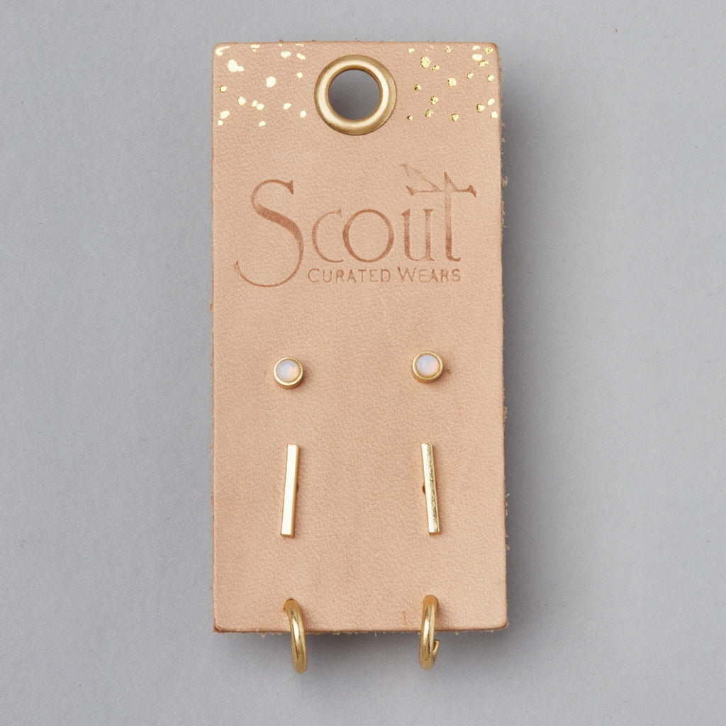 The Scarlett Stud Trio Opalite Gold from Scout Jewelry is beautifully showcased on a beige leather card with "Scout Curated Wears" embossed in gold letters. This elegant presentation includes gold-colored stud earrings and matching linear drop earrings. The card, adorned with a few decorative gold specks and featuring a small hole at the top, proudly indicates that these hypoallergenic earrings are as safe as they are stylish.