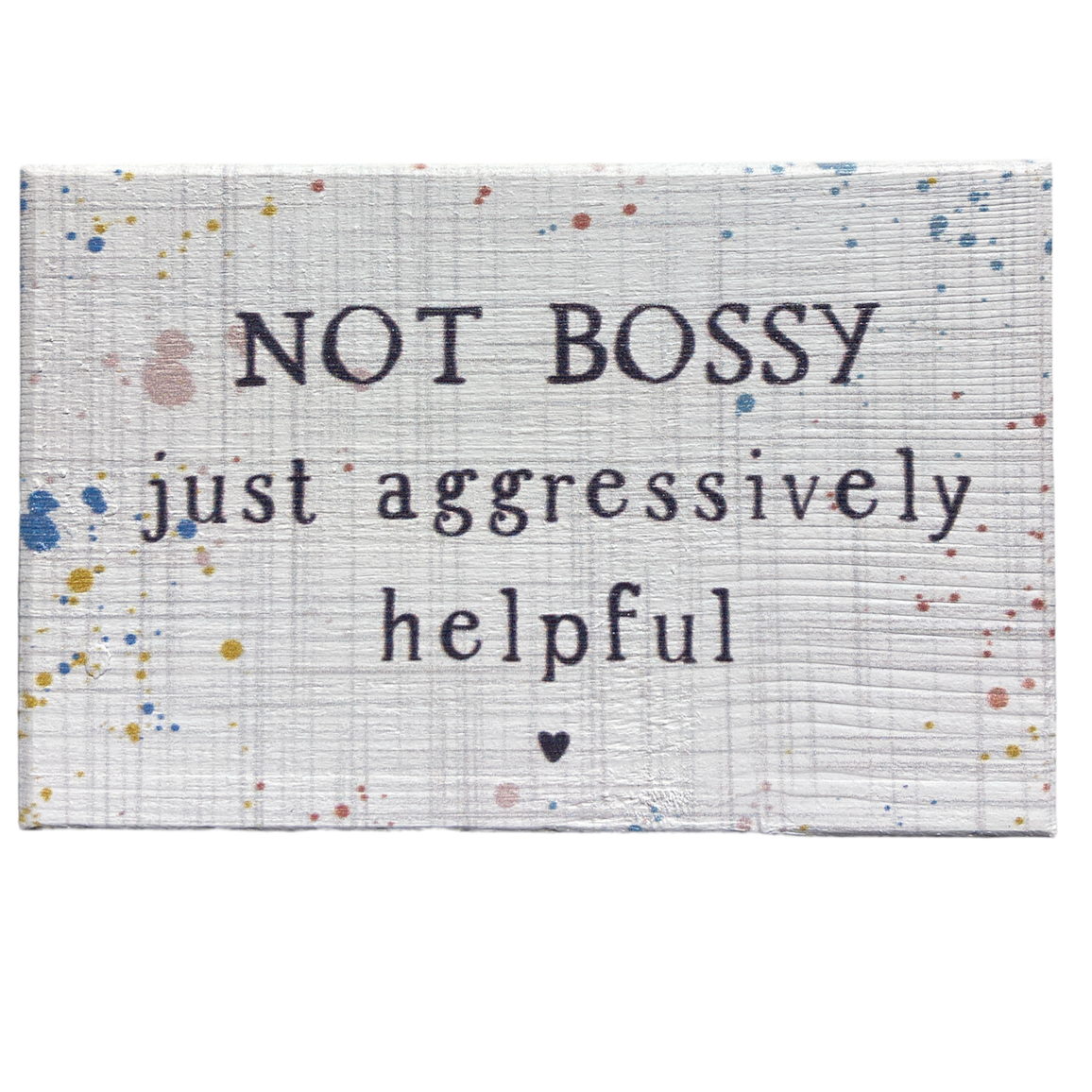 The "Not Bossy" sign by SincereSurroundings features a white wood texture adorned with colorful splatters, and displays the phrase "NOT BOSSY just aggressively helpful" with a small heart beneath the text. This delightful piece is perfect for easy display and adds a touch of whimsy to any space.