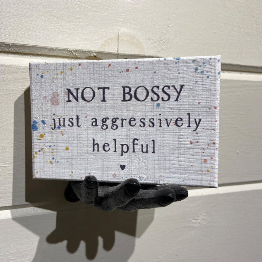 A small, handcrafted sign named "Not Bossy" by SincereSurroundings features a speckled pattern and the words "NOT BOSSY just aggressively helpful." It is elegantly displayed on a wall-mounted decorative hand for easy showcasing.