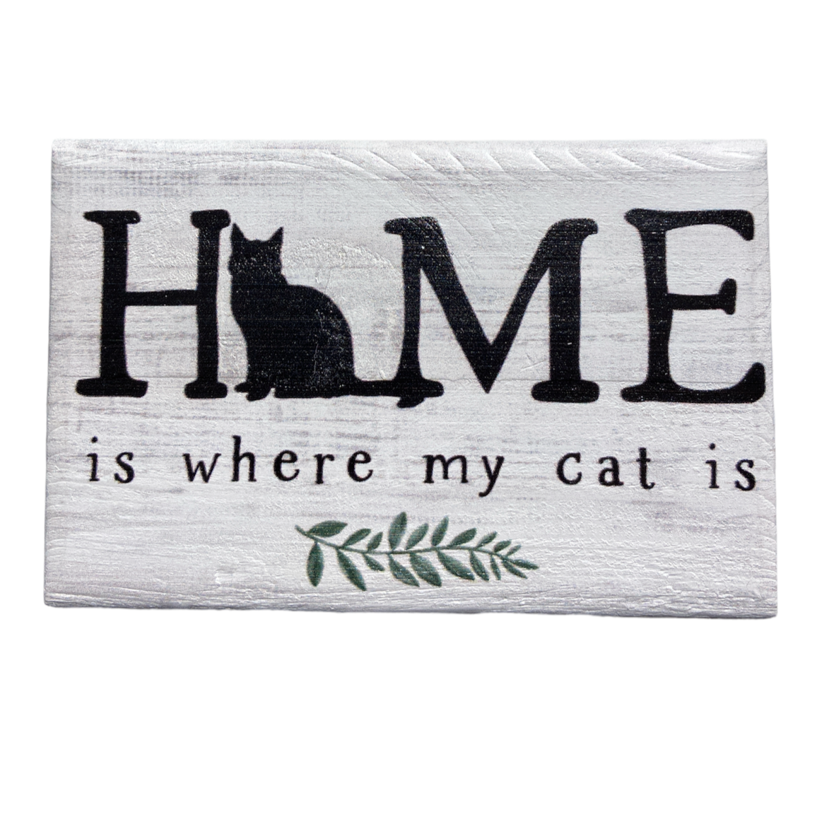 The "Home Is Where Cat" sign by SincereSurroundings is a handcrafted wooden piece featuring the phrase "HOME is where my cat is" in black text. The letter "O" in "HOME" includes a silhouette of a sitting cat, accompanied by a small green leaf graphic below. This charming display boasts a rustic white-washed finish and is made in Rock Rapids, IA.