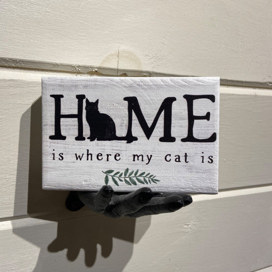 The SincereSurroundings "Home Is Where Cat" decor piece features a small wooden sign held by a black sculpted hand. The sign showcases the phrase "HOME is where my cat is," with a silhouette of a sitting cat incorporated into the word "HOME" and a small green twig illustration below the text. This handcrafted item adds charm to any display.