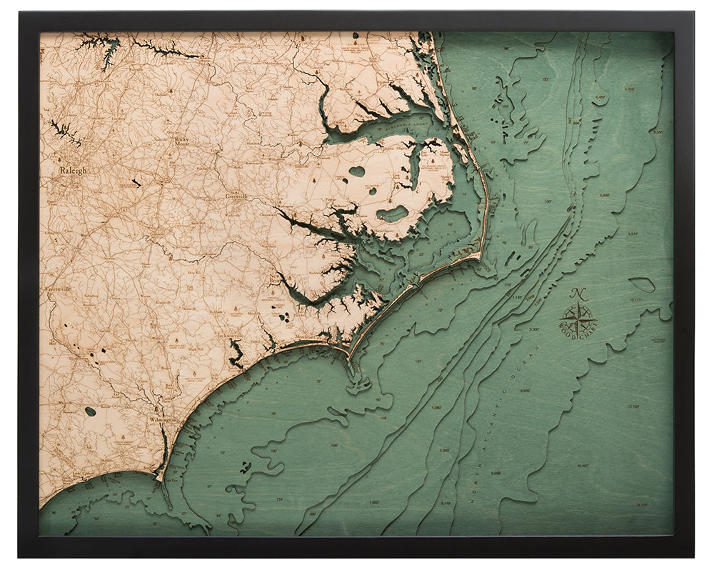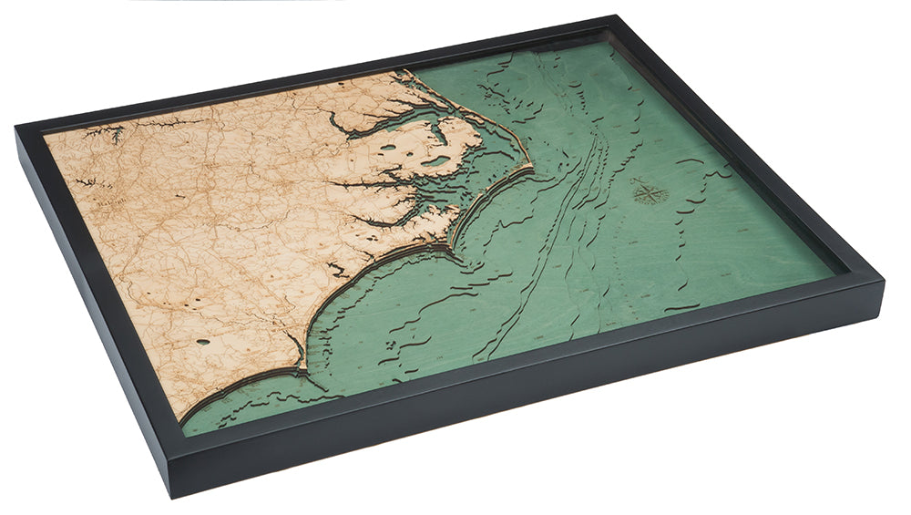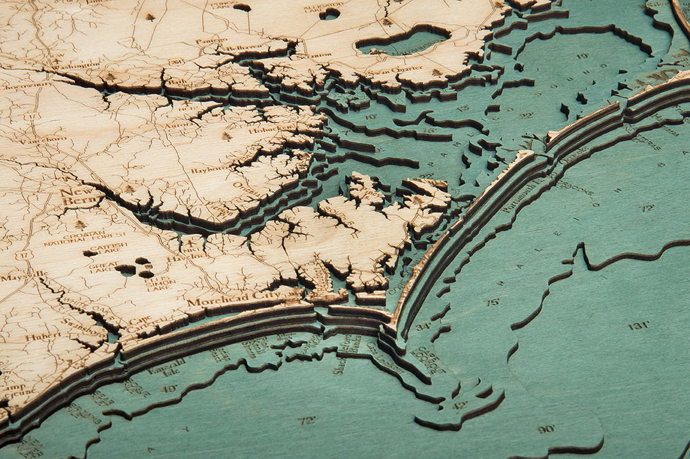 The North Carolina Coast 3D wood map highlights the waterways and points of interest in high-quality birch. Laser-cut to precisely detail the shoreline and surrounding land, each piece is glued together seamlessly to create the topography and bathymetry of the North Carolina Coast. The wood is hand-stained to create visual depth, and the points of interest are etched into the wood. Your nautical map is finished in a solid wood frame and protected by acrylic glass.