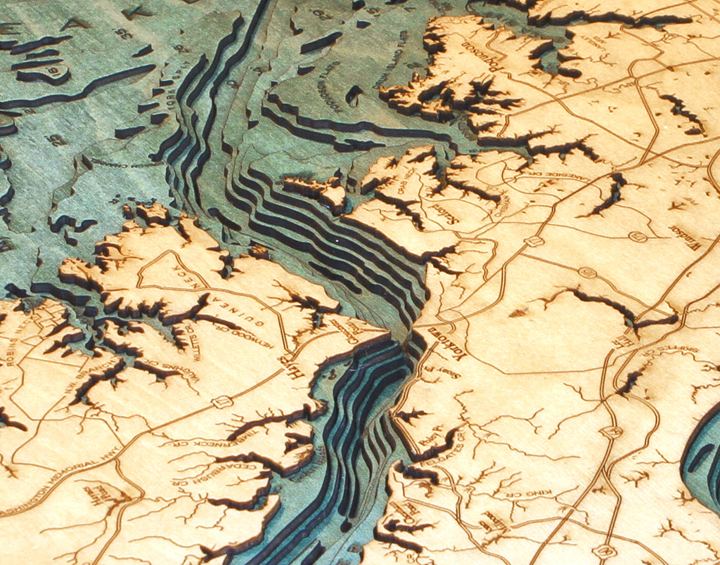 Each of our 3D wood maps is made with the most incredible attention to detail to ensure a one-of-a-kind piece of wall art you can enjoy for years to come. Birch is laser cut into layers representing the topographic landscape and then glued together to create breathtaking depth and dimension. The water is hand-stained, and points of interest are carved into the nautical wood map’s surface. A custom wood frame and acrylic cover finish off the map.