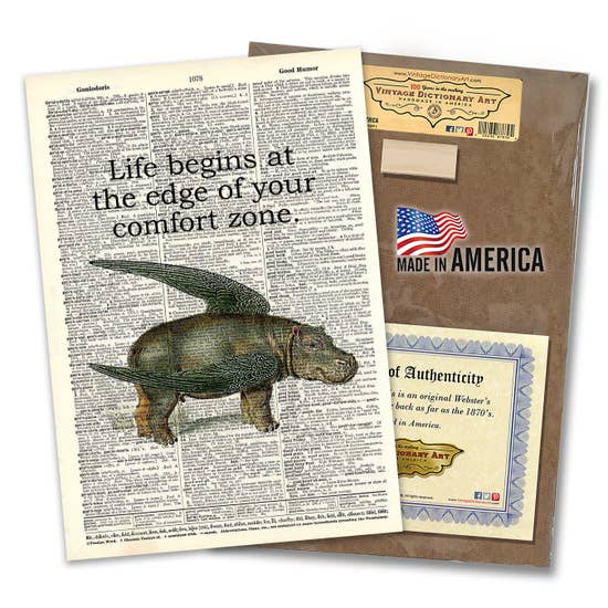 Art prints are made from vintage re-purposed, original 100-year-old Webster's Dictionary pages, delicately removed from the books by hand and printed with a whimsical saying, quote, or graphic. Each unique print is permanently mounted to a hardwood board with a hanger attached, making it ready to hang and enjoy right away! No framing is necessary. Individually wrapped in a clear cellophane sleeve with a certificate of authenticity included. THESE ARE NOT REPRODUCTIONS.