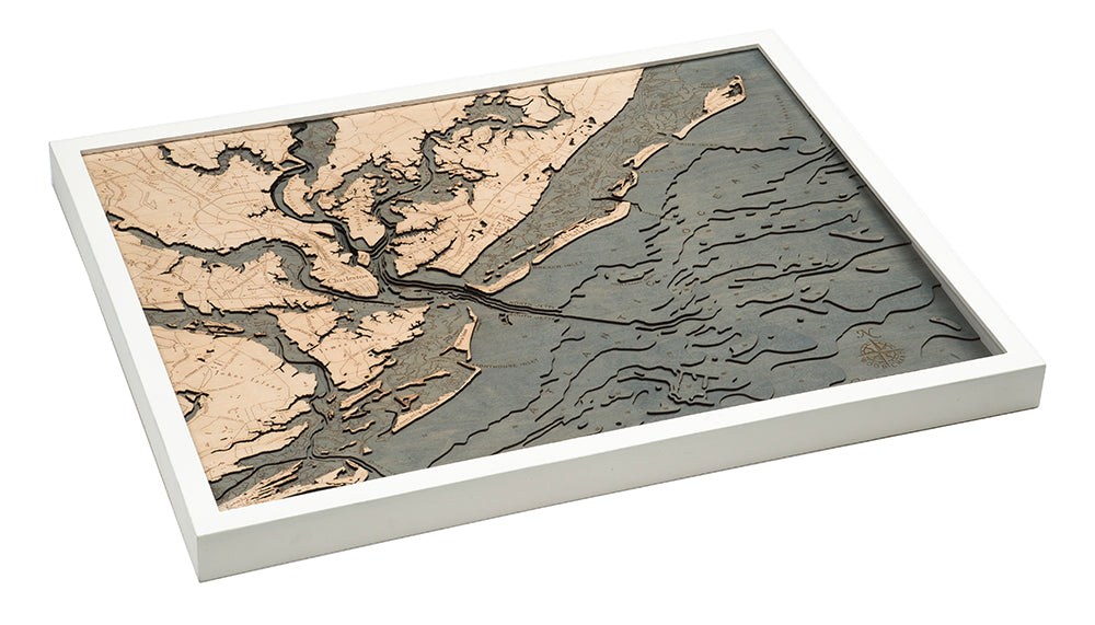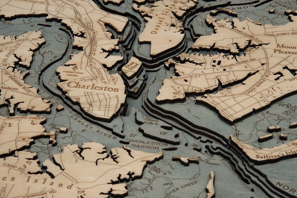 Our 3D nautical wood map of Charleston, South Carolina, is made using laser-cut layers of natural Birch. The pieces are glued together to create the visual depth of the beautiful coastline and barrier islands with 2mm precision, and the water is hand-stained to add an extra pop of color. Points of interest and landmarks are etched into the map’s surface before an artist pairs the map with a custom wood frame and acrylic cover for durability and protection.