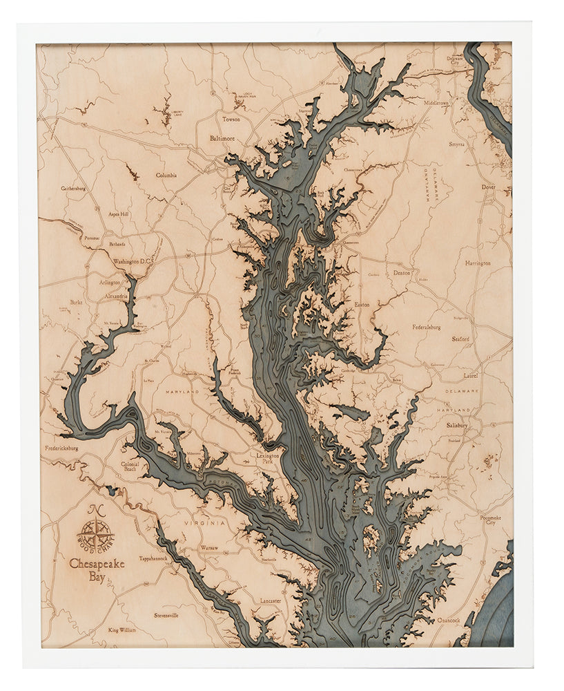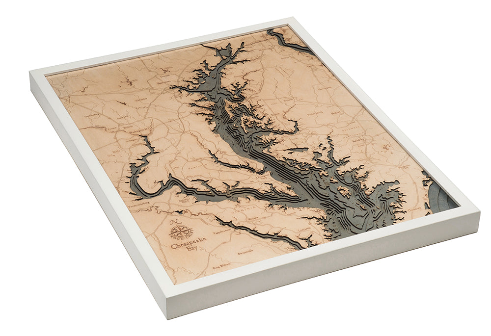 The WoodChart Chesapeake Bay 24.5" x 31" map features layered, engraved wood in a white frame, detailing land and water with “Chesapeake Bay” labeled in the lower left corner.