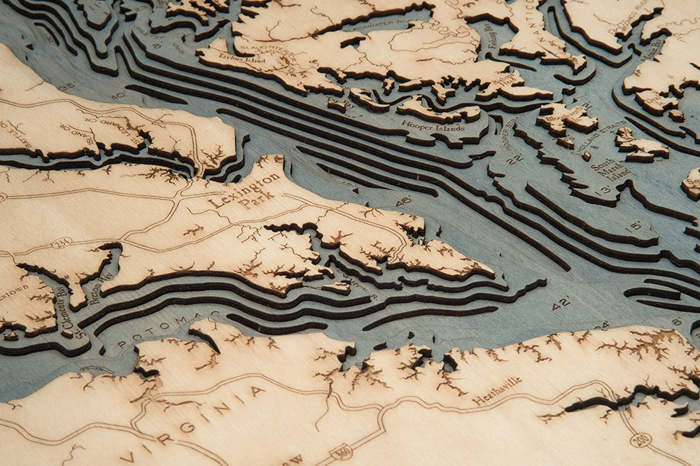Our 3D nautical wood map of Chesapeake Bay features laser-cut layers of Birch that have been glued together to create the stunning visual depth of the lake’s topography. The water is hand-stained, and points of interest and major roadways are etched into the wood’s surface. This nautical wood map is one of the most precise and detailed you’ll find, and each piece is finished with a custom wood frame and ultra-transparent acrylic for maximum durability and protection.