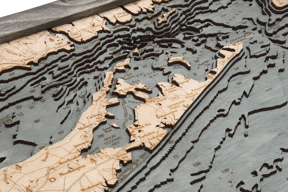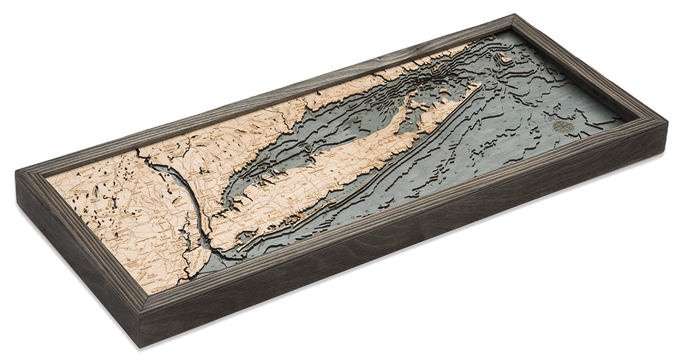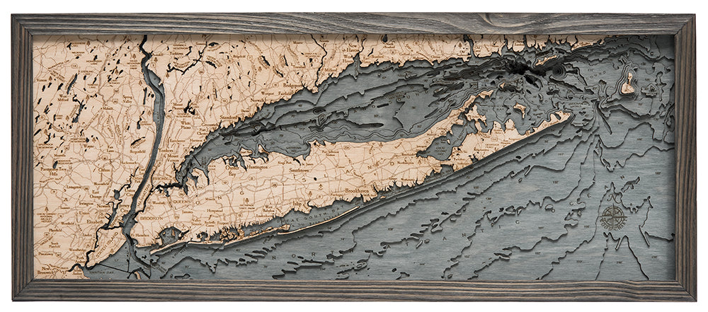 WoodChart’s Long Island Sound 13.5" x 31" Grey Frame is a rectangular, framed wooden map featuring detailed coastlines and elevation of Long Island and nearby New York and Connecticut, with blue water and light wood land tones.