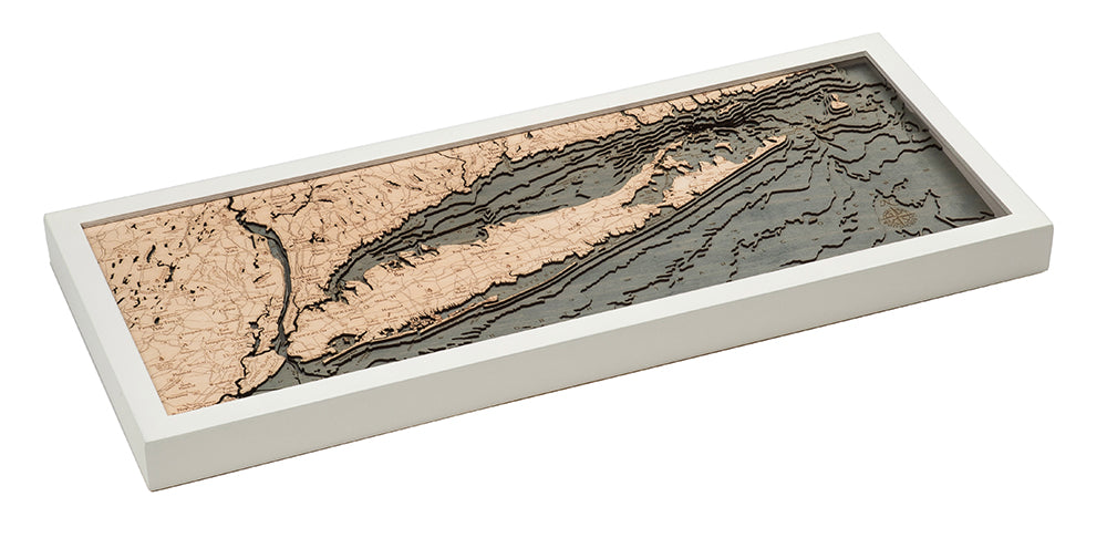 The WoodChart Long Island Sound 13.5" x 31" White Frame is a rectangular, layered wooden map featuring carved contours of the island and water in contrasting light and dark wood tones with detailed topography.