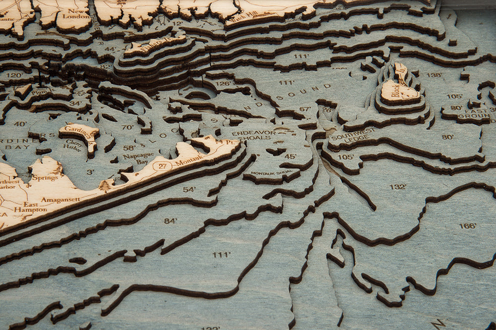 Each 3D wood map begins with a bathymetric chart. An artist uses the chart’s measurements to laser cut the exact shoreline on pieces of high-quality birch. The birch is glued together and hand-stained to accent the natural beauty of the nautical map, and then points of interest and landmarks are etched into the wood’s surface. Each 3D wood map is finished with a custom-sized solid wood frame and acrylic layer, creating a piece that you will love for years to come.