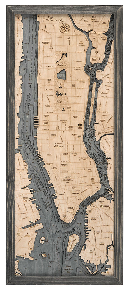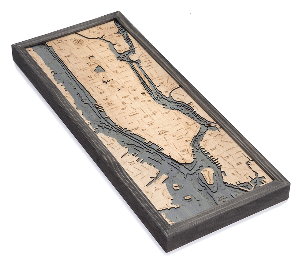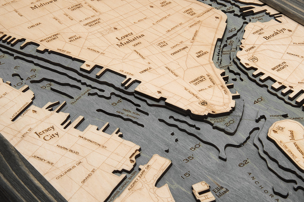Our wood chart of Manhattan, New York begins as a bathymetric chart. An artist uses the information to laser cut pieces of high-quality birch into distinct layers to depict the area's topography, then expertly glues them together to create a dimensional look that leaps off the wall. The layers of water are hand-stained, and the surface of the nautical wood map is engraved with points of interest, water depths, and details that make our maps the most accurate and detailed on the market. Each 3D wood map is finished with a custom size solid wood frame and acrylic protective layer.