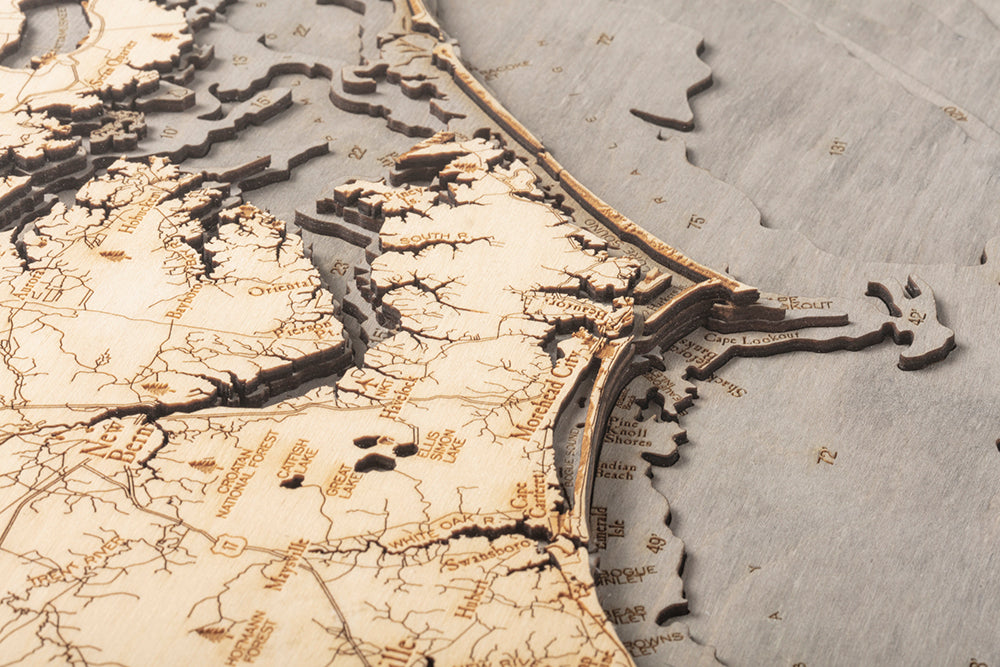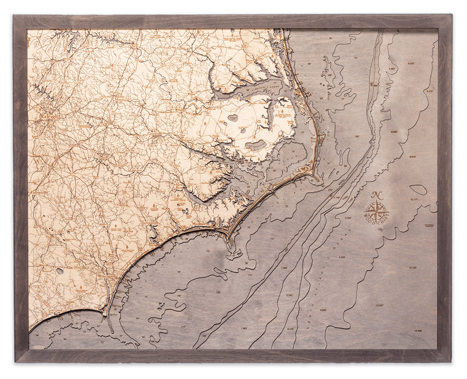 The North Carolina Coast 3D wood map highlights the waterways and points of interest in high-quality birch. Laser-cut to precisely detail the shoreline and surrounding land, each piece is glued together seamlessly to create the topography and bathymetry of the North Carolina Coast. The wood is hand-stained to create visual depth, and the points of interest are etched into the wood. Your nautical map is finished in a solid wood frame and protected by acrylic glass.