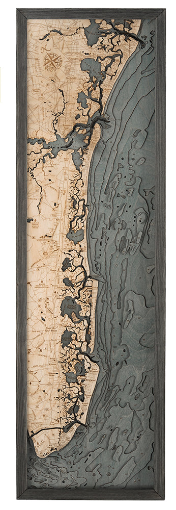 Examine the details of the South NJ Shore on a 3D wood map and marvel at the bathymetry of the coast. Each point of interest is etched into the high-quality birch, providing a special perspective of the depths and shallows of the Southern NJ Shore. The nautical wood map is finished in a custom, solid wood frame, protected by acrylic glass, and arrives ready to hang.