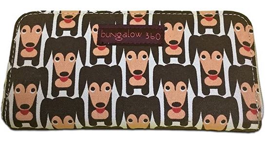 The Zipper Wallet Happy Dog by Bungalow 360 showcases a charming cartoon dog design, where brown dogs with long ears and pink noses are repeated across the cotton canvas material. A sewn label displays "Bungalow 360" in red text. This vegan wallet is not only stylish but also supports animal causes proudly.