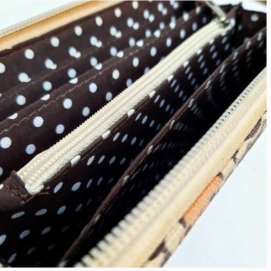 A close-up of the Zipper Wallet Happy Dog by Bungalow 360, crafted from cotton canvas, highlighting its multiple zippered compartments lined with brown fabric and white polka dots. The beige exterior showcases a subtle pattern, ideal for those who support animal causes.