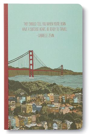 The product features an illustration of a cityscape with vibrant buildings and a red bridge over water, beautifully designed to enhance its charm. The cover displays the text, "They should tell you when you're born: have a suitcase heart, be ready to travel. - Gabrielle Zevin," in modern typography that complements the aesthetic. This item is part of the COMPENDIUM brand and titled "They should tell you when.