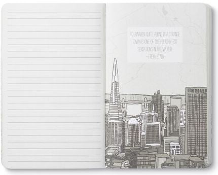 A notebook from COMPENDIUM titled "They should tell you when" features open pages with lines on the left and a stunning city skyline design on the right, adorned with an elegantly printed quote by Herb Caen in modern typography.